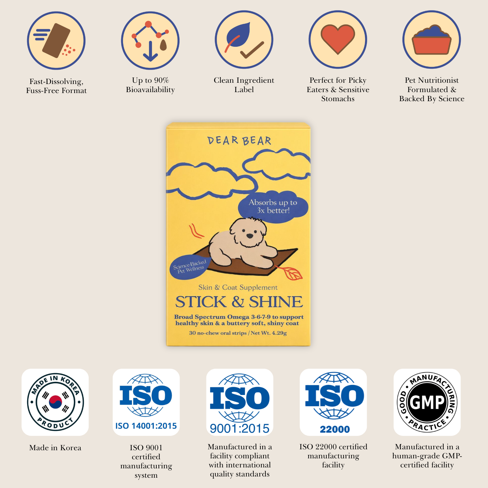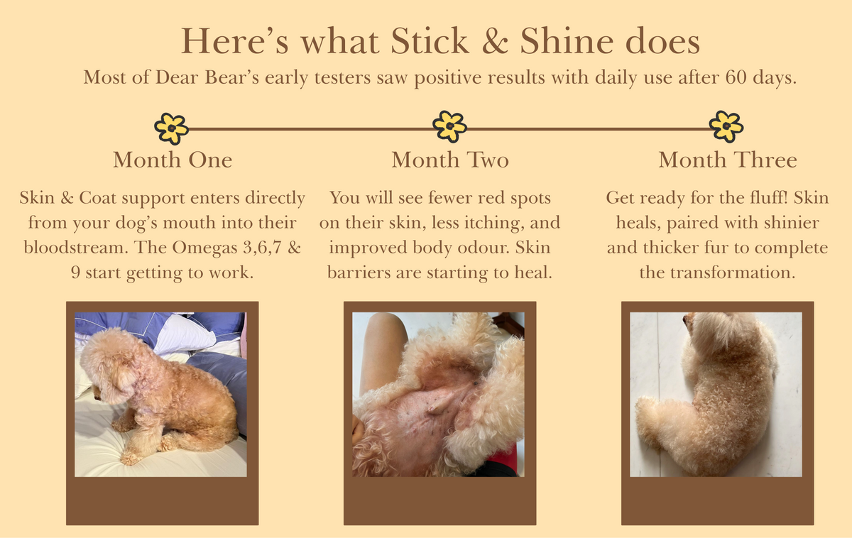 Stick & Shine is a daily skin & coat oral strip supplement made with premium omega-rich nutrients to support healthy skin and a glossy coat.